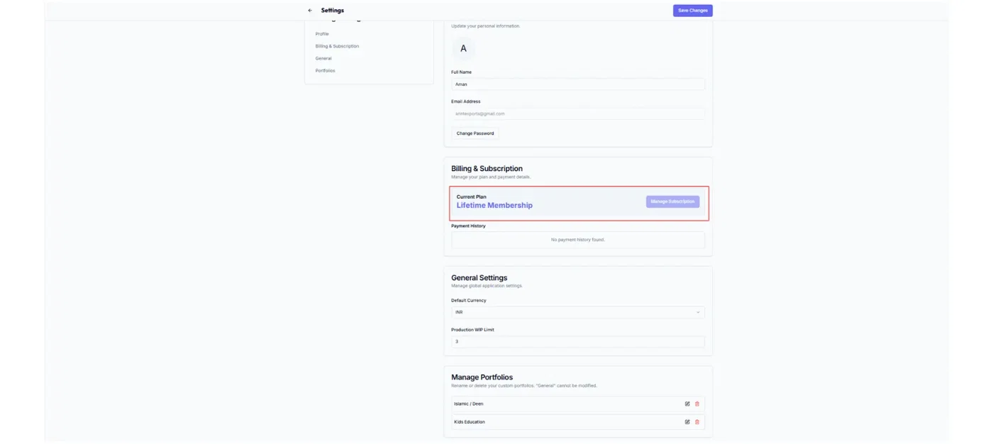 Billing & subscription (plan, receipts, payment method)