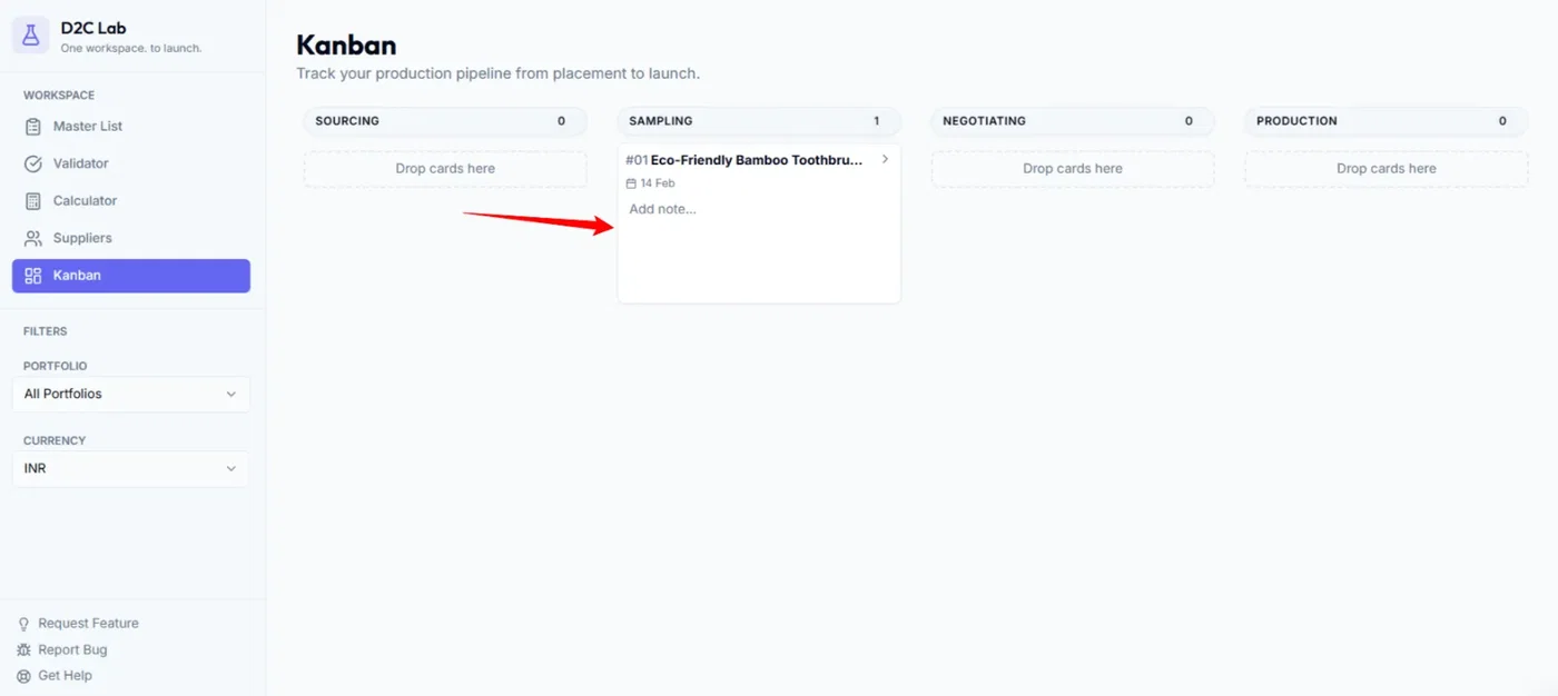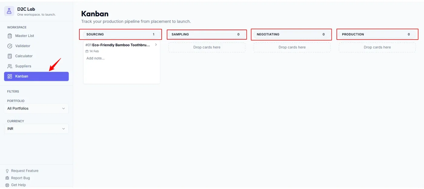 How to use the Kanban board to track a product from Sourcing → Launched, what each stage means, and how moving cards updates the product stage across D2C Lab.