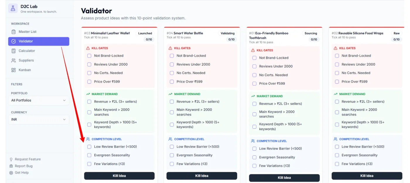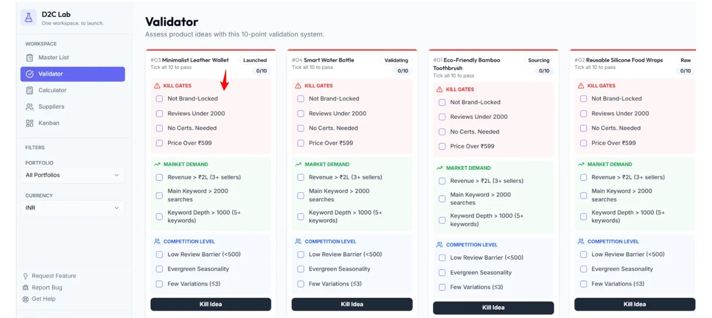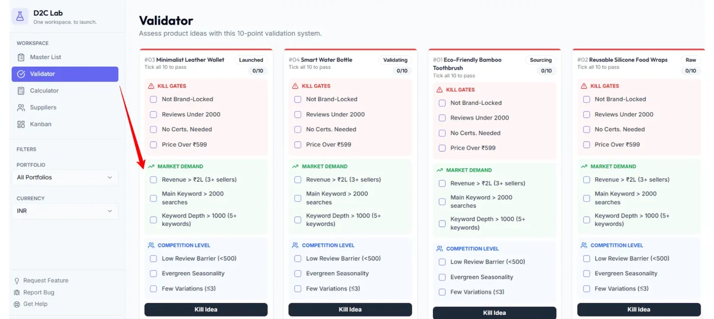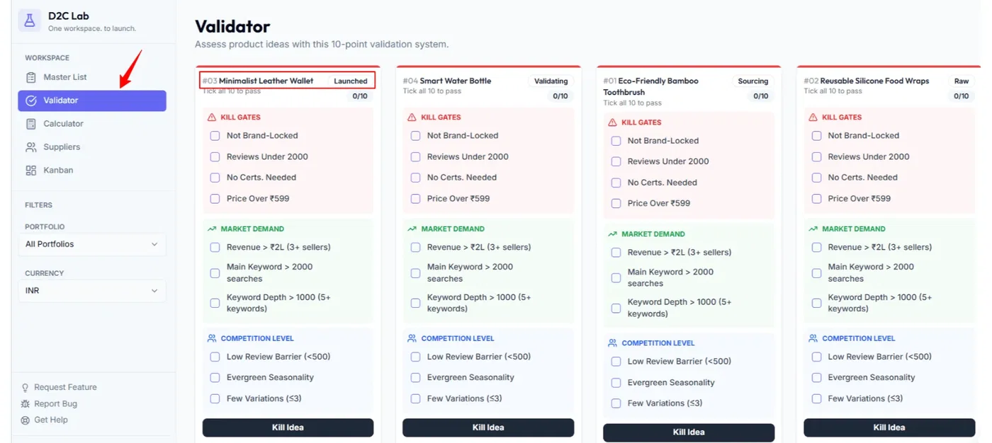 How to use the Validator to quickly decide whether an idea is worth pursuing — using structured checklists, kill/revive, and clear progress indicators.