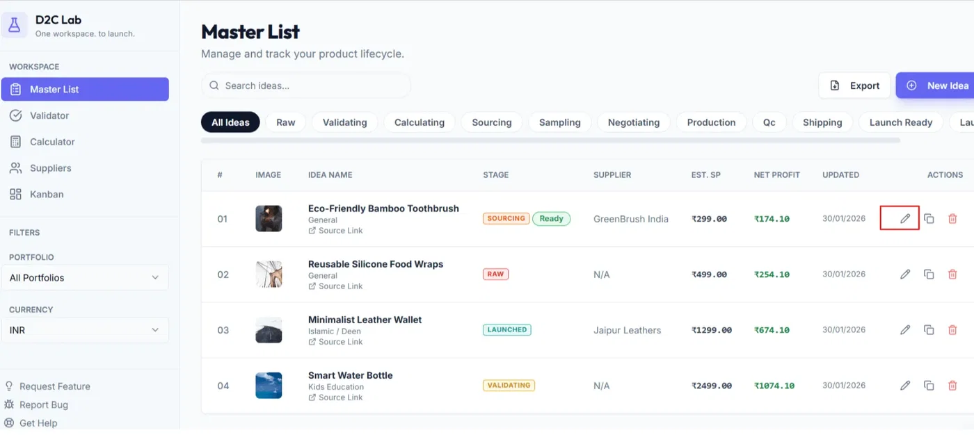 How to create your first product idea in D2C Lab, what fields to fill, and how to edit it later.