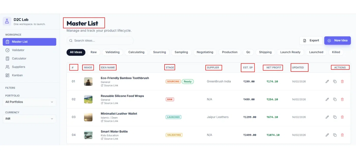 Use Master List to shortlist ideas based on stage + net profit.
